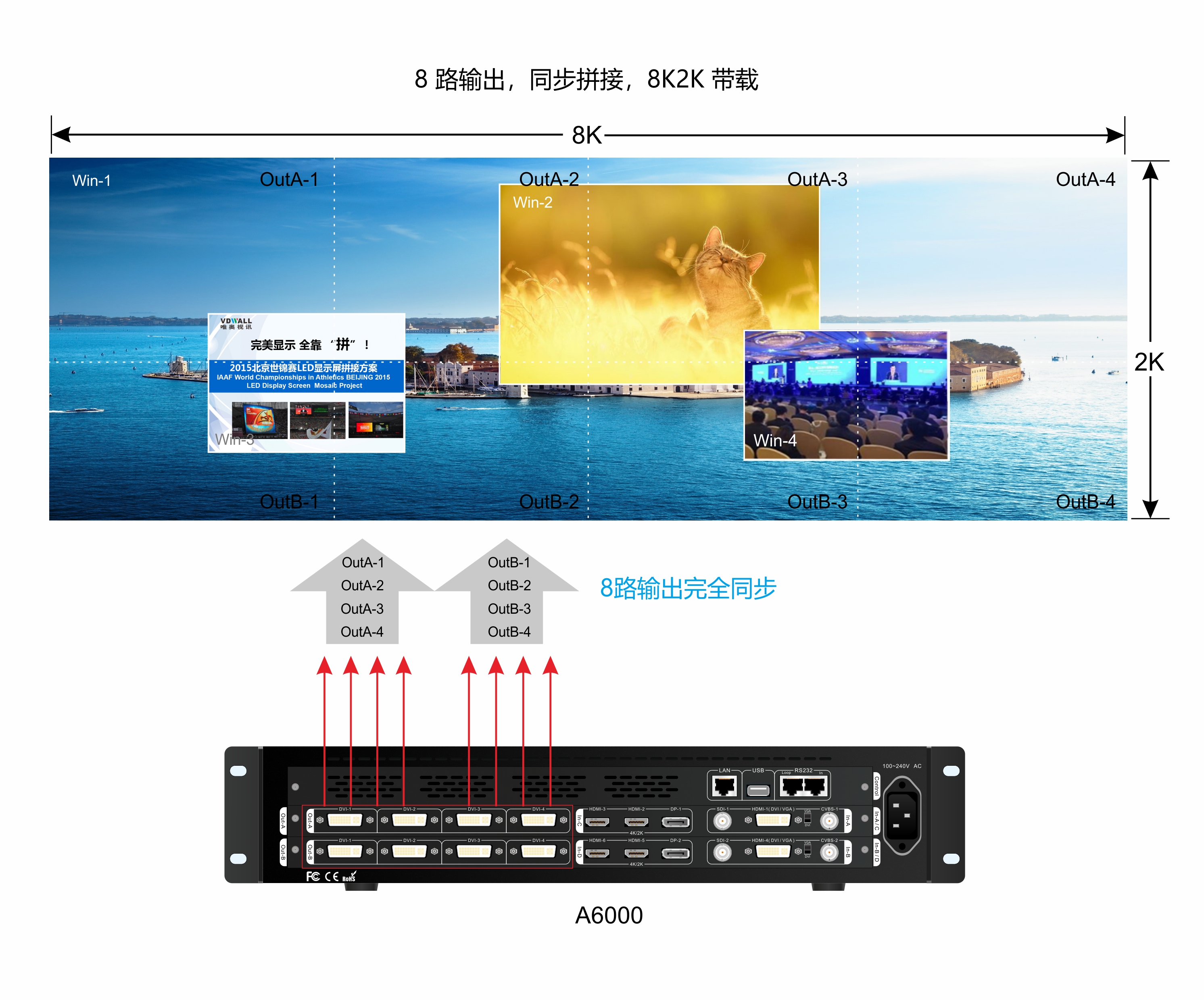 8路DVI輸出,同步拼接,帶載1800萬像素點LED屏