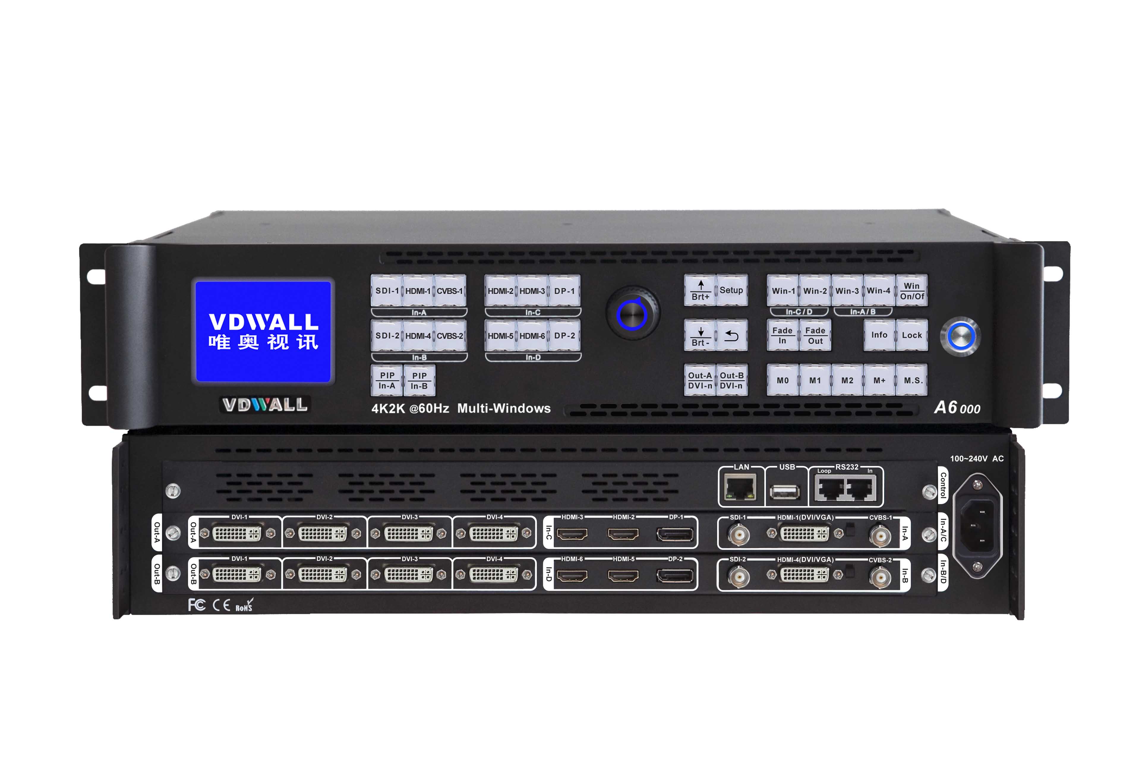 6路4K2K_60Hz超高清數字視頻輸入,其中:4×HDMI2.0(支持HDCP2.2)、2×DP1.2;