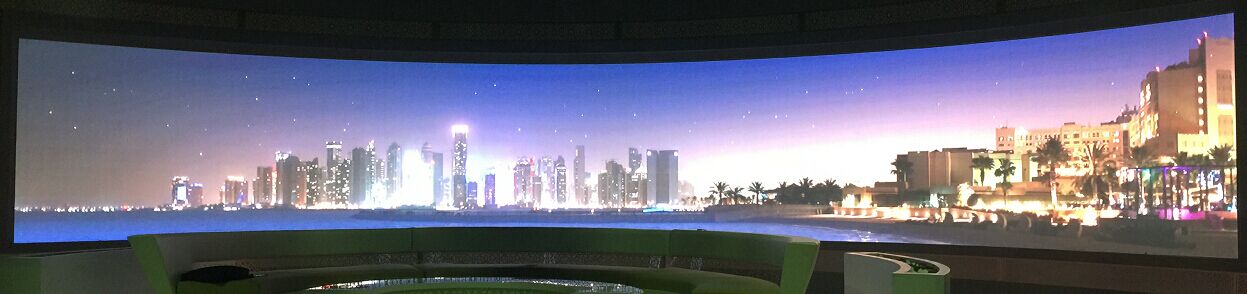 超大LED顯示屏拼接,LED弧形屏由4部分組成,使用一臺LVP7000對其進行拼接,并同時顯示四路輸入信號畫面。