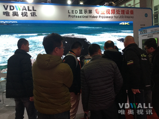 唯奧視訊本次展出的重磅產品是專門針對4K小間距屏幕拼接的LVP609真4K極清處理器,相比LVP608 4K處理器在技術上又有了新的突破,單口接收4K2K_60Hz極清視頻信號,點對點同步輸出,單機最大可拼接8K2K,總像素可達1600萬。為配合LVP609的調控演示,唯奧視訊搭建30平米的高清LED顯示屏,真實唯美的視覺體驗吸引了大量觀眾駐足,用于展示LVP609的中央主控臺也一直被觀展客戶和業內技術人員簇擁包圍。