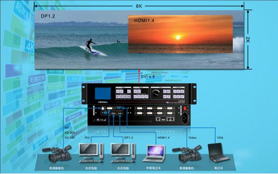 LVP608是業(yè)內(nèi)第一臺(tái)真正意義上的專業(yè)LED顯示屏4K2K處理器,不需要對(duì)視頻源進(jìn)行任何特殊處理,單口即可接收4K2K信號(hào),點(diǎn)對(duì)點(diǎn)同步顯示到LED顯示屏,最大可帶載8K2K/60Hz。可針對(duì)不同的LED顯示屏物理分辨率不同設(shè)置輸出分辨率大小,做到無極縮放,任意截取輸入信號(hào)全屏顯示。LVP608采用插卡設(shè)計(jì),支持多格式的輸入信號(hào)源:1*VIDEO、2*VGA、1*3G-SDI、1*DVI/HDMI1.3、1*HDMI1.4、1*DP1.2,最大8路DVI 1080P輸出。支持單物理接口HDMI1.4或DP1.2接收4K2K高速數(shù)字信號(hào),實(shí)現(xiàn)4K2K超高清底圖點(diǎn)對(duì)點(diǎn)同步顯示,播放4K2K的動(dòng)態(tài)快速視頻時(shí)圖像流暢,畫質(zhì)清晰,性能穩(wěn)定。單機(jī)在超高清底圖上可開PIP/PBP,任意窗口圖像可跨屏漫游、調(diào)整任意大小位置。實(shí)現(xiàn)超高清視頻(4K2K)、高清視頻(1080P)和標(biāo)清視頻輸入信號(hào)源間可進(jìn)行任意的快速無縫切換或淡入淡出的切換、圖像平鋪、開窗、疊加、融合等靈活的畫面合成功能、多種預(yù)存快速一鍵切換模式調(diào)用。強(qiáng)大的2倍放大同步拼接功能,單物理接口接收4K2K信號(hào),放大8K2K輸出,無論是水平和垂直方向同步顯示,畫面流暢。另具有同步監(jiān)視,可使用1080P的顯示器同步監(jiān)視4K2K輸入畫面。