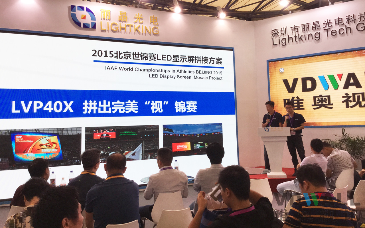 為了配合重磅推出的業內首款專業4K處理器LVP608,唯奧視訊的展示墻配置了長12米、高3米的4K LED顯示屏,由麗晶光電友情贊助144個P3.91的箱體搭建而成,這也是展館內最大的顯示屏之一。當屏幕亮起,超高清的畫面質感,精致的細節,絢麗的色彩和震撼的場景展現得淋漓盡致,過往客商無不駐足觀賞、拍照。在小間距、異形屏、3D顯示屏林立、視覺交互體驗十足的浦東新國際展覽中心,4K屏幕低調的華麗,為唯奧視訊賺足了眼球。