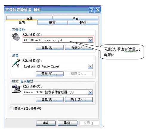 a. 右擊任務欄中的喇叭圖標選擇“播放設備”,選擇調整音頻屬性,將聲音播放的默認設備選擇為ATI(NVDIA) HD Audio rear output,如無該選項,請嘗試在HDMI線接好視頻處理器&視頻處理器當前信號選擇為HDMI的前提下重新啟動電腦