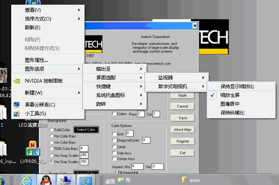 設置方法一: 右鍵點擊桌面空白位置,在彈出菜單中選擇“圖形選項”→“屏面適配”→“數字式電視機”→“保持縱橫比”,則DVI信號分辨率變為與主顯示器相同。