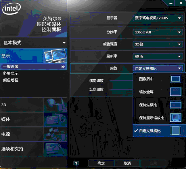 設置方法二:右鍵點擊桌面空白位置,在彈出菜單中選擇“圖形屬性,進入intel圖形和媒體控制面板,在“顯示”→“一般設置”菜單下,選擇顯示器數字式電視機LVP605,將縮放選項設置為自定義縱橫比,DVI信號分辨率變為與主顯示器相同。