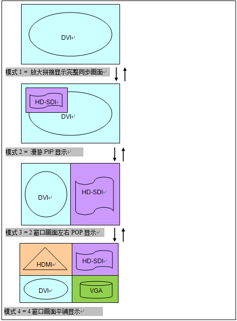 各輸入信號(hào)間無(wú)縫/淡入淡出切換,同時(shí)4畫面預(yù)監(jiān)