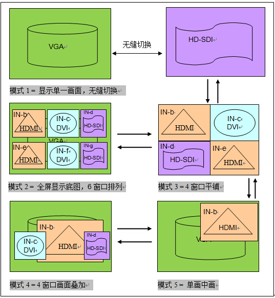 LED大屏顯示1---7任意窗口畫面,每個窗口大小、位置任意調整,窗口疊加次序任意設置