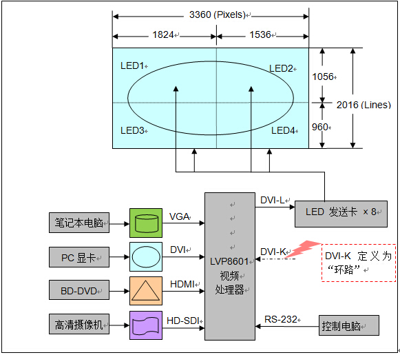 一臺LVP8601完成4塊LED屏同步放大拼接+多畫面任意開窗疊加
