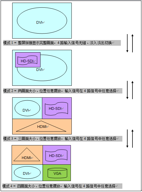 各輸入信號間無縫/淡入淡出切換,同時4畫面預(yù)監(jiān)